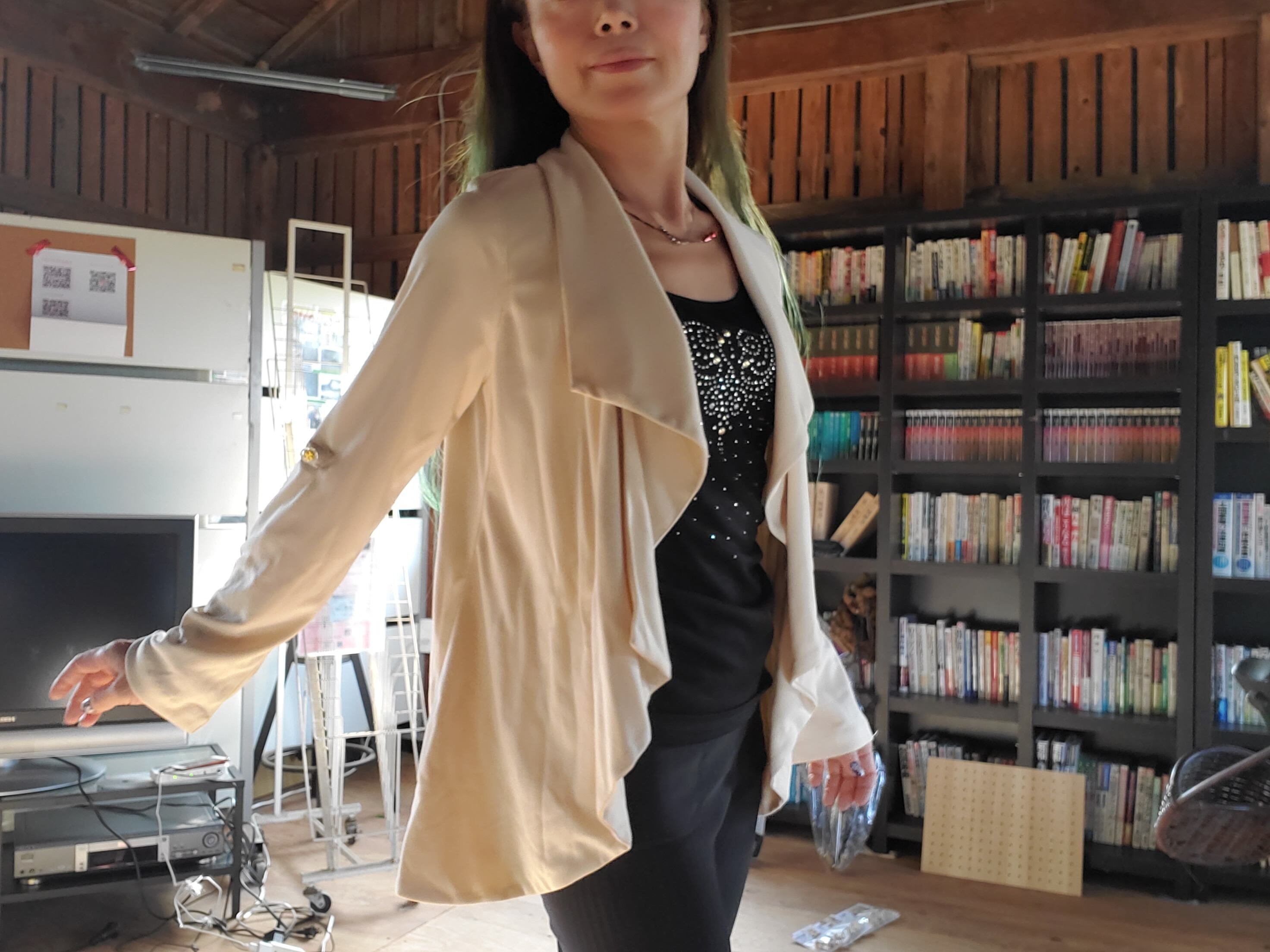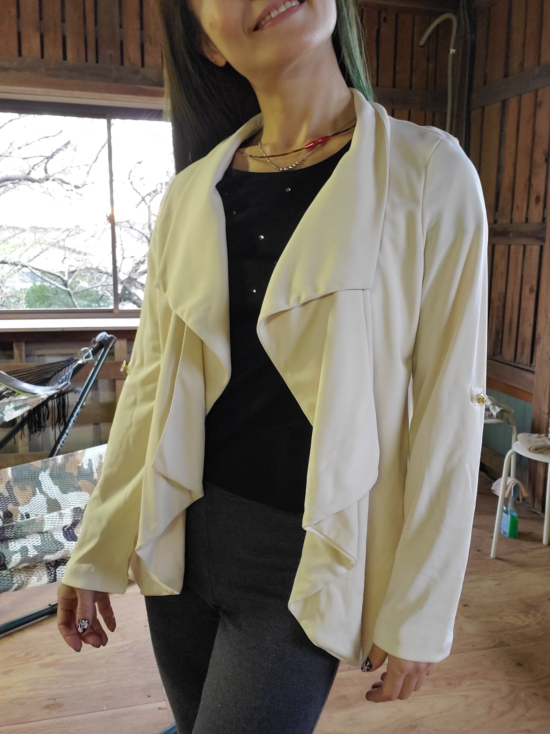 襟にドレープがフェミニンなさらっとした素材のソフトジャケット。CECIL McBEEです。サイズはMです。衣装レンタルも可能です!!